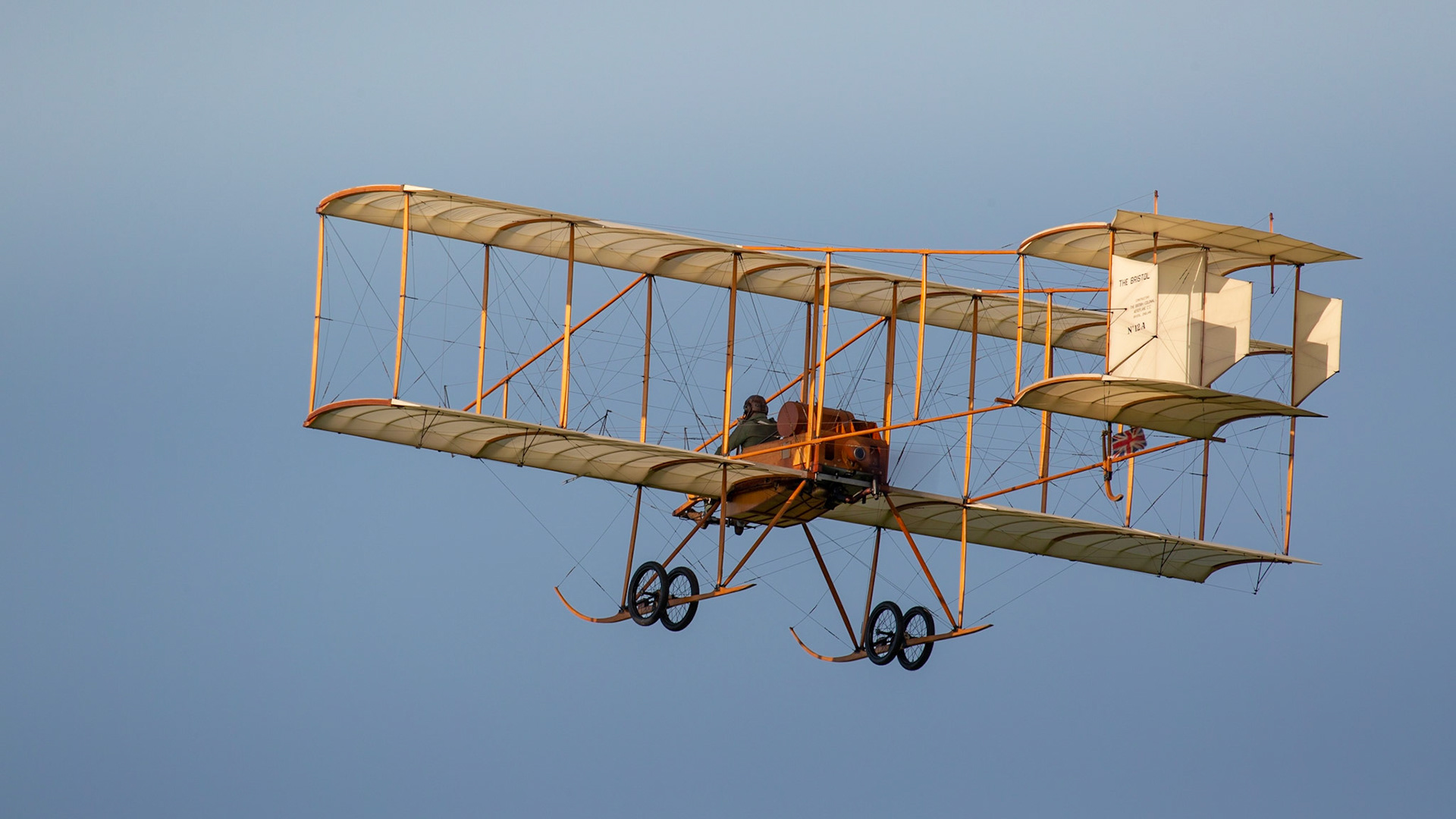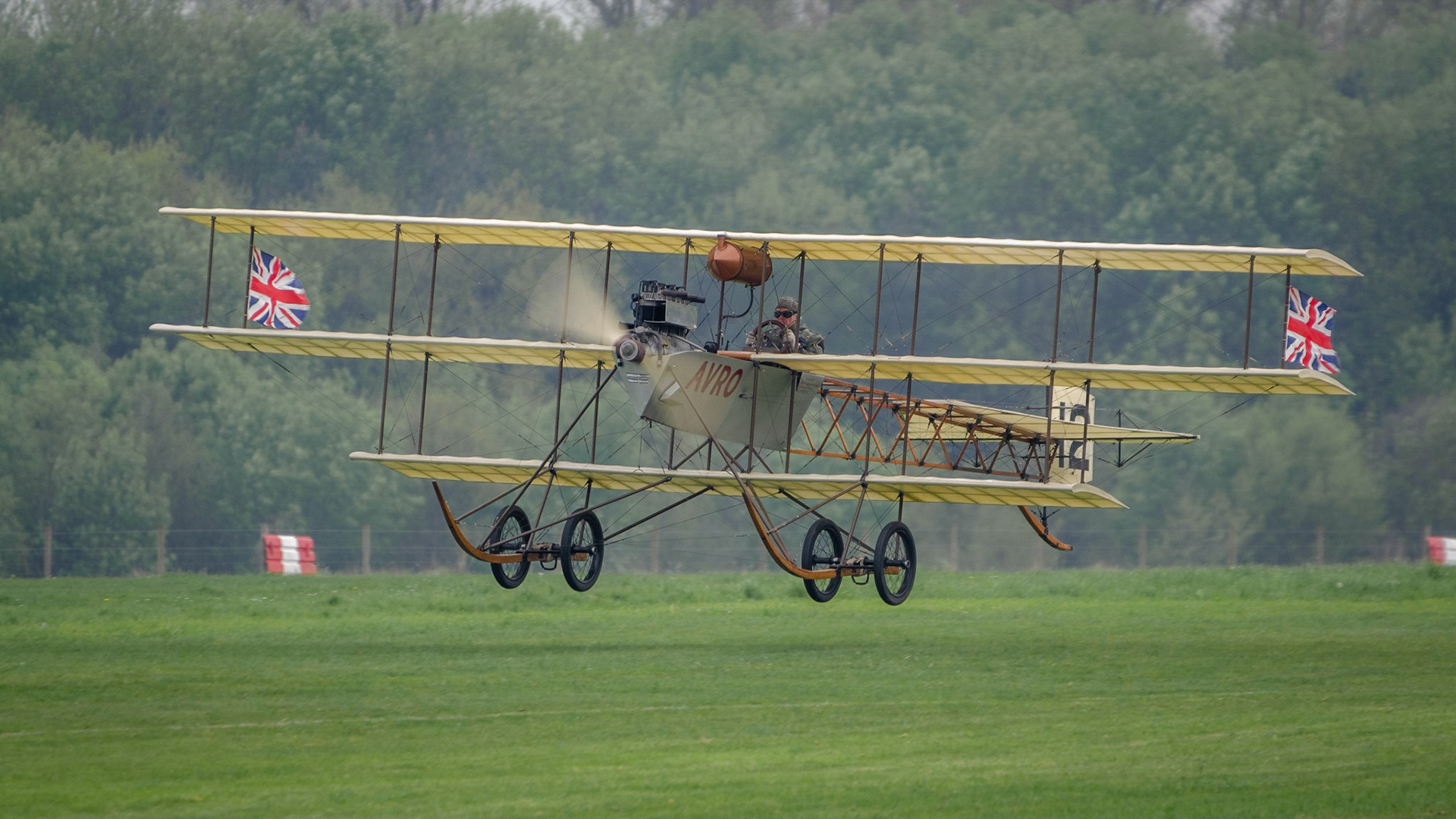 Biggleswade, UK - 6th May 2018: A Flying replica of the Avro Triplane 1910 in flight at the Shuttleworth Collection.