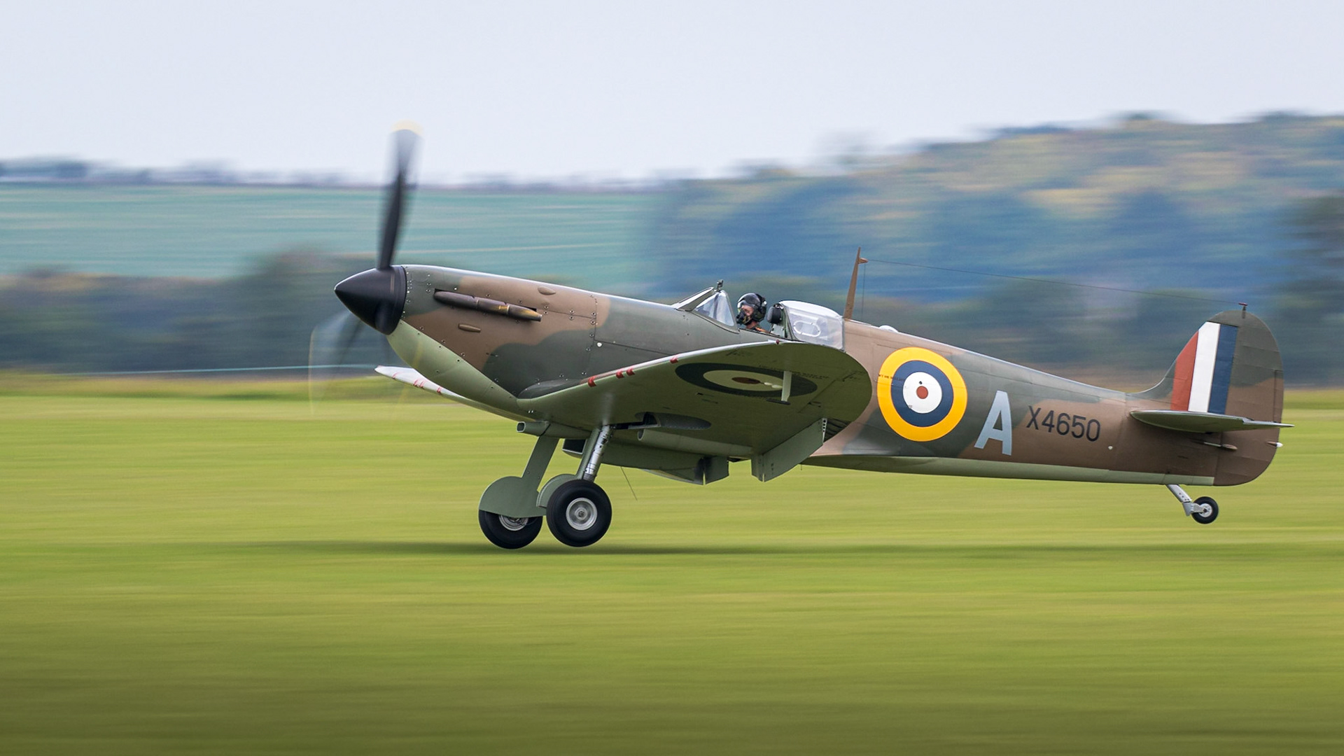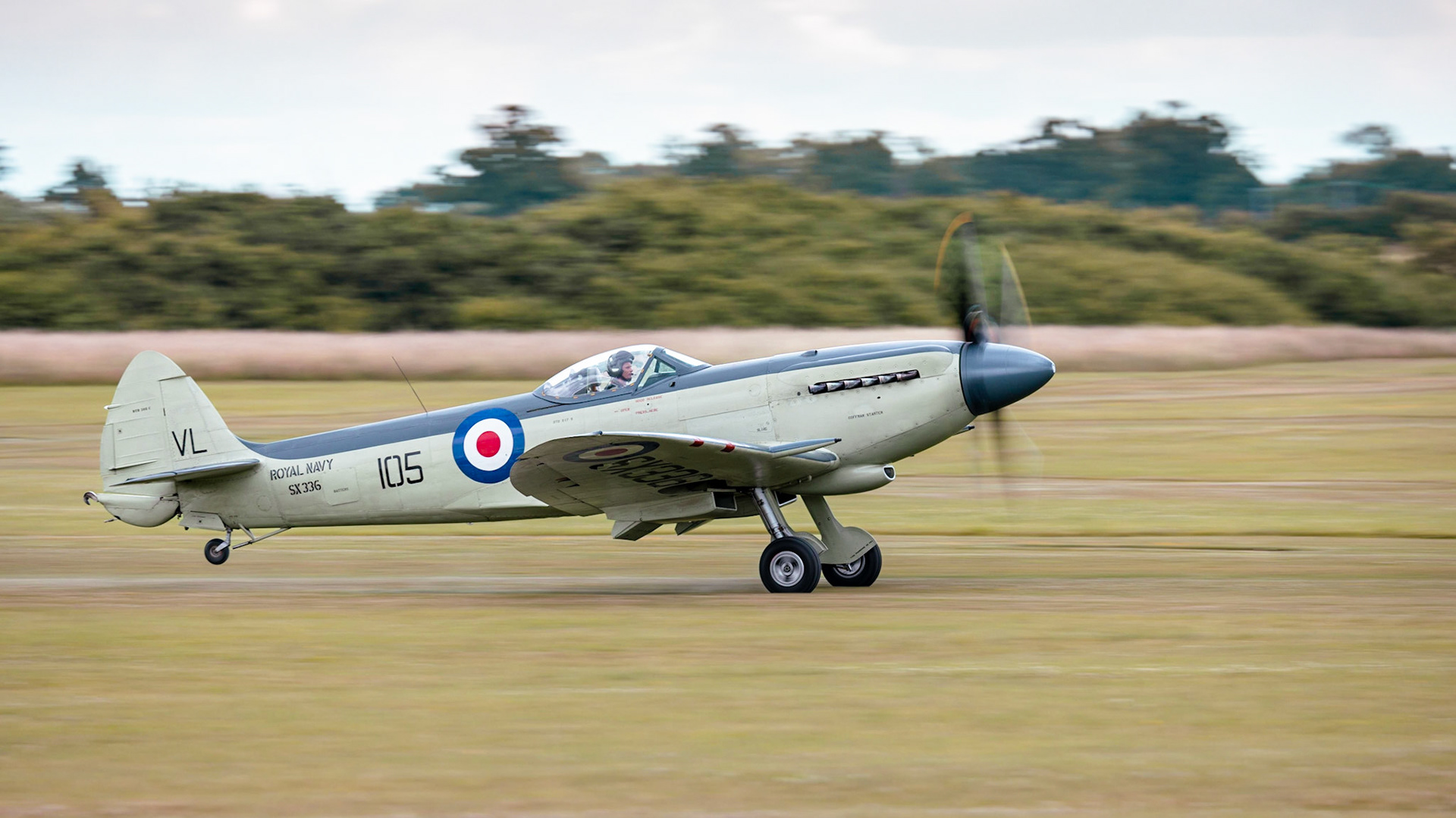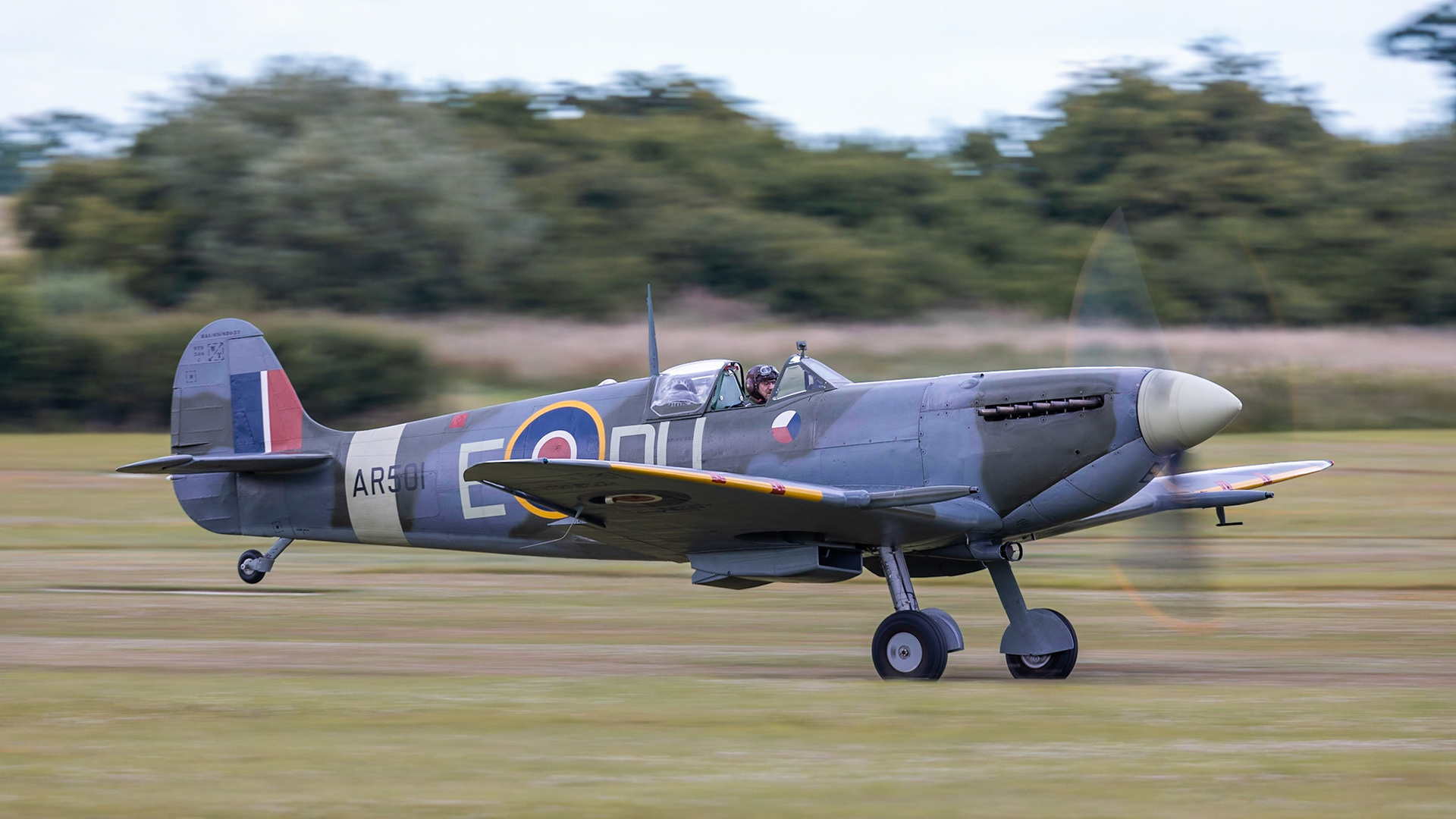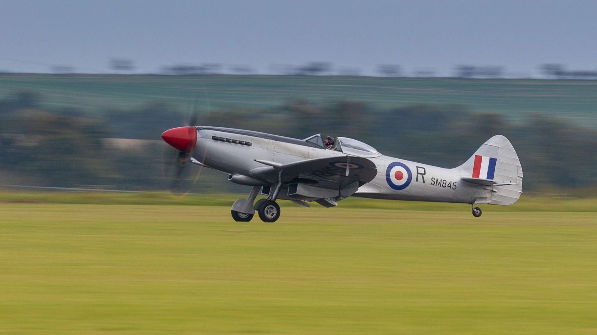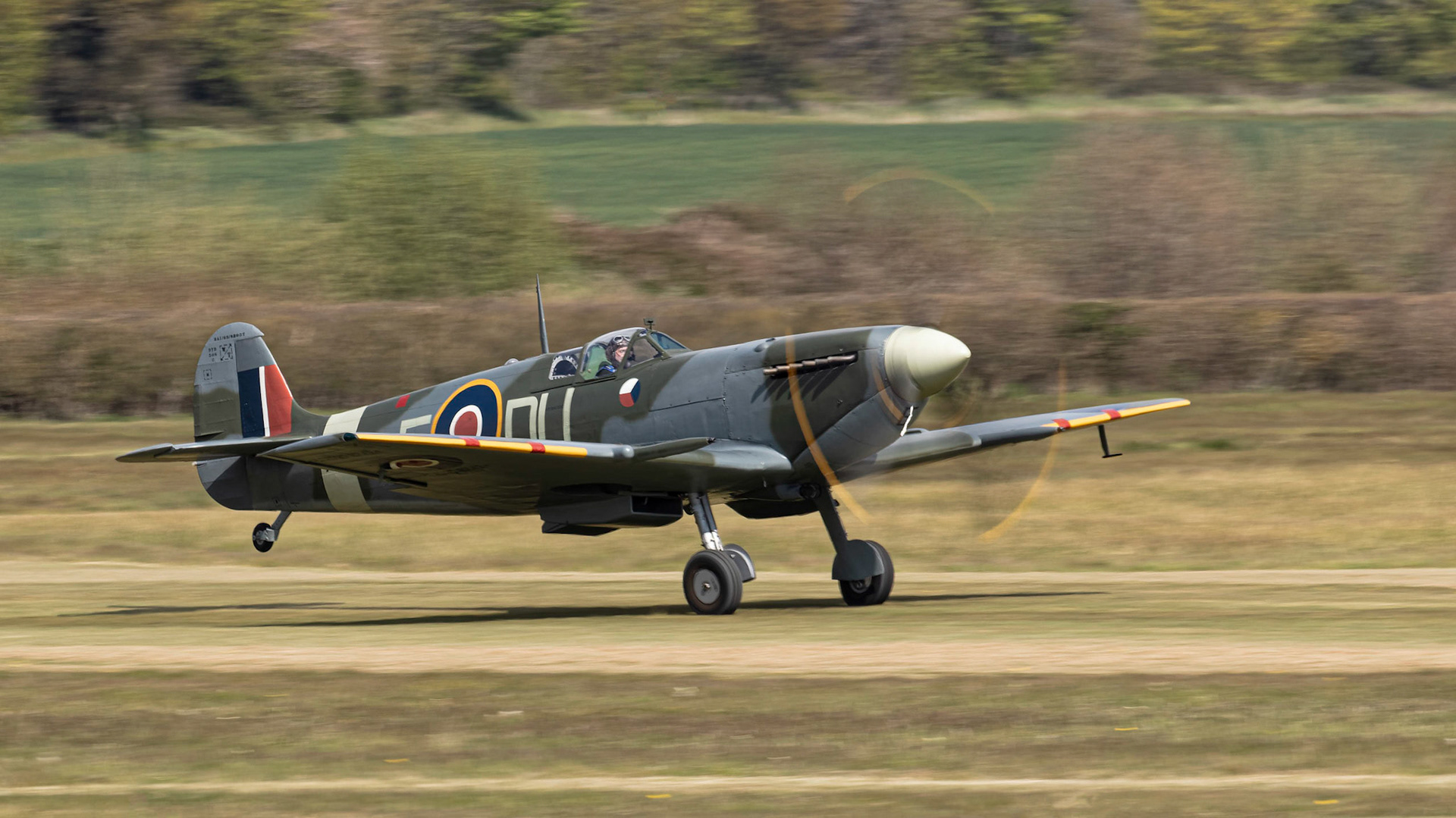 Old Warden, UK - 4th August 2019: A vintage world war two British Spitfire fighter plane landing on airfileld